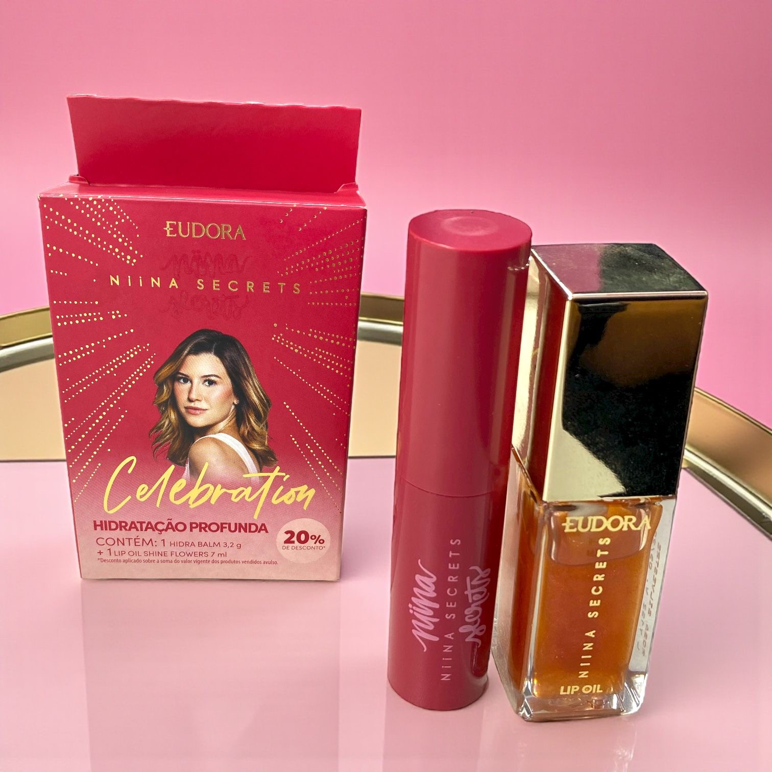 Niina Secrets Celebration traz esse combo com Lip Oil eHidra Balm para você personalizar a sua maquiagem. Os produtos podem ser usados em conjunto ou separados!