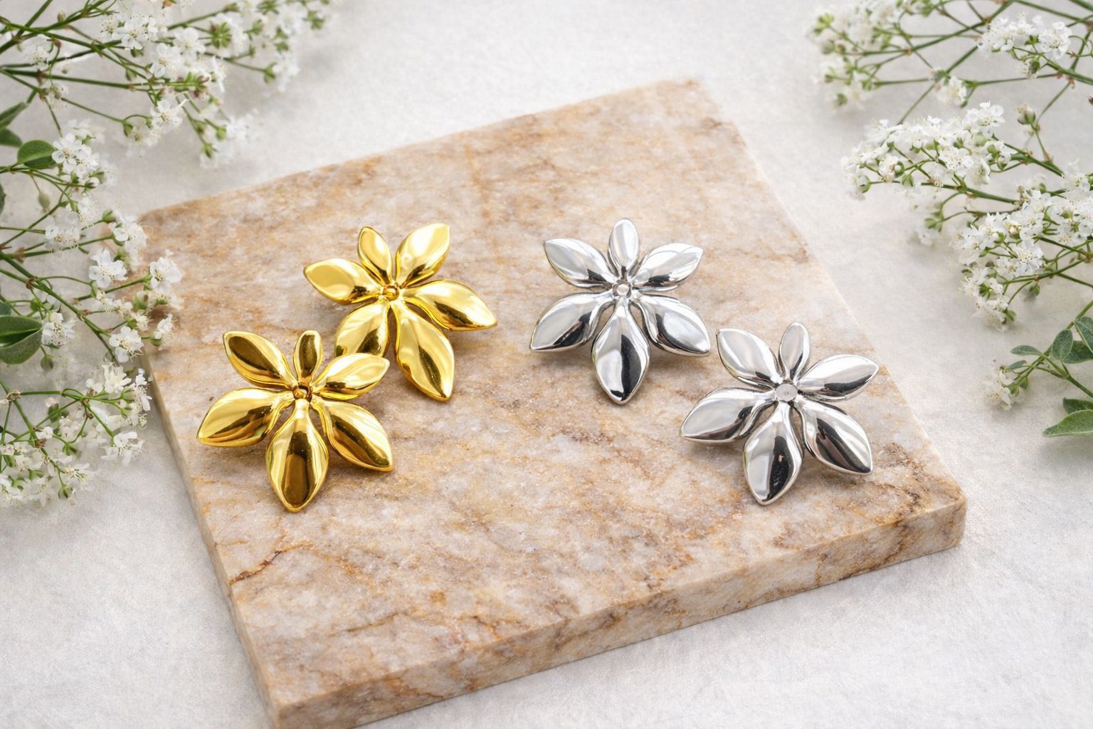 Delicados e cheios de charme, nossos brincos folheados em formato de flor são a escolha perfeita para quem busca elegância no dia a dia ou um toque especial em ocasiões especiais. Produzidos com material de alta qualidade e folheados para maior durabilidade, eles oferecem brilho sofisticado sem perder a leveza. Um acessório feminino que combina com qualquer estilo e realça sua beleza natural.