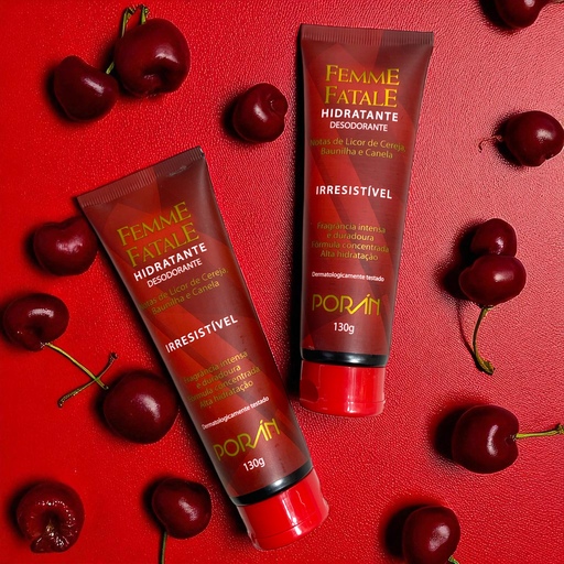 O Hidratante Irresistível da linha Femme Fatale Porán une o poder hidratante de uma fórmula concentrada com uma fragrância marcante e quente, revelando notas de Licor de Cereja, Baunilha e Canela. Ideal para quem busca um cuidado diário que vai além da hidratação — é uma experiência sensorial envolvente e provocante.